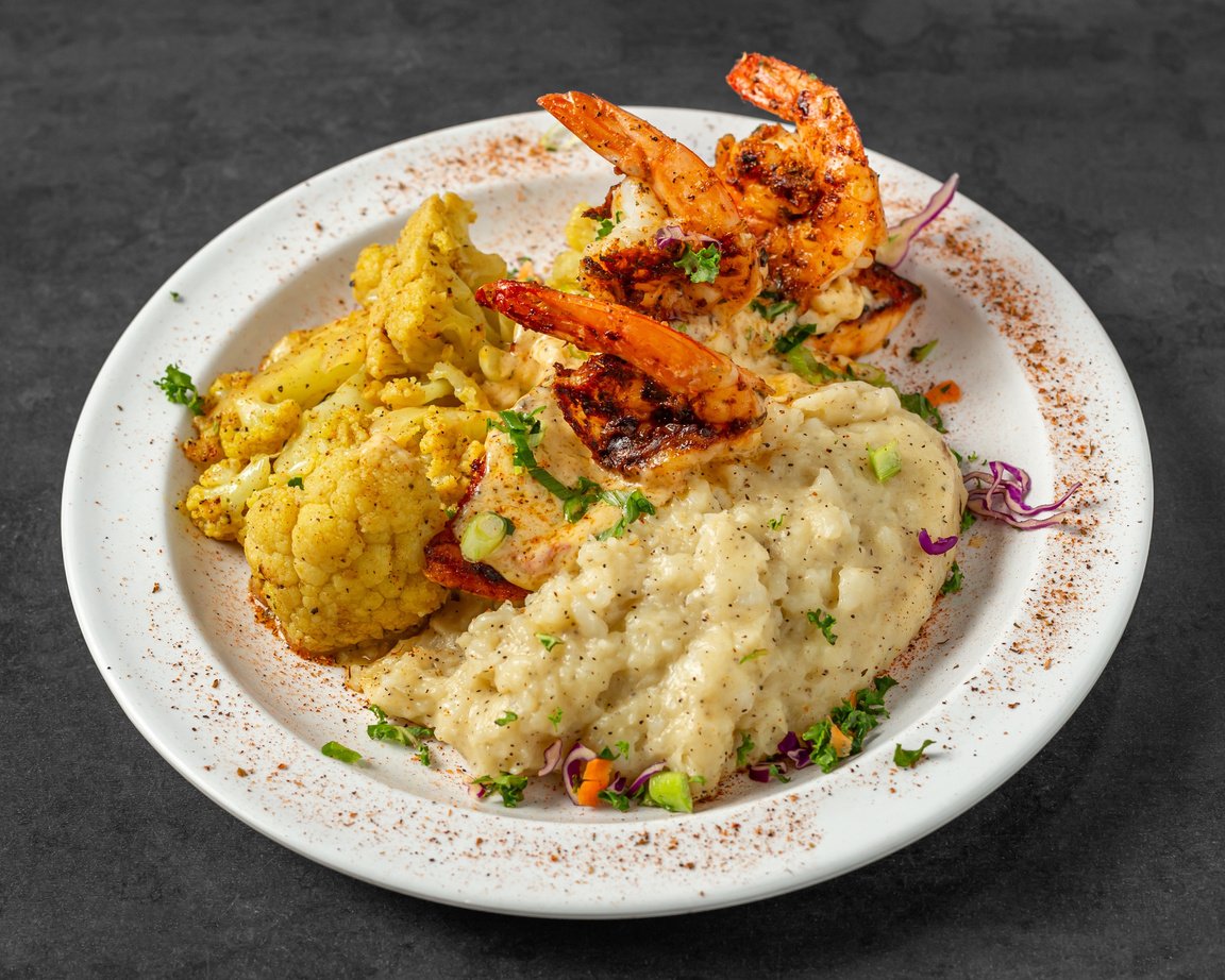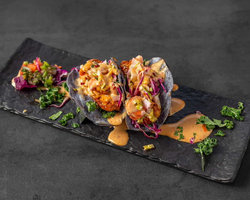 Succulent catfish vibe slaw, bang bang sauce garnished with fried popcorn shrimp